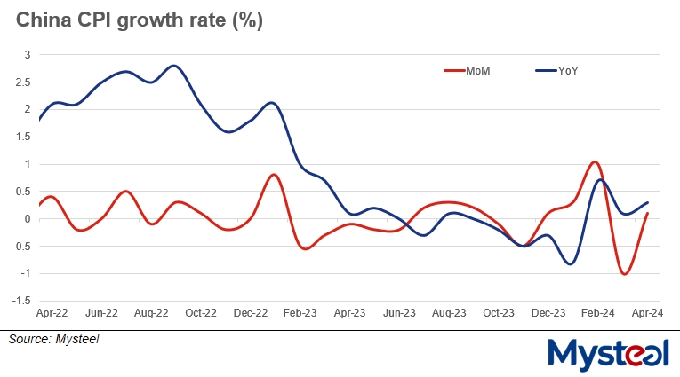 Over January-April, China's CPI nudged up 0.1% on year overall, while the PPI dropped 2.7% compared with the same period last year, according to NBS statistics.