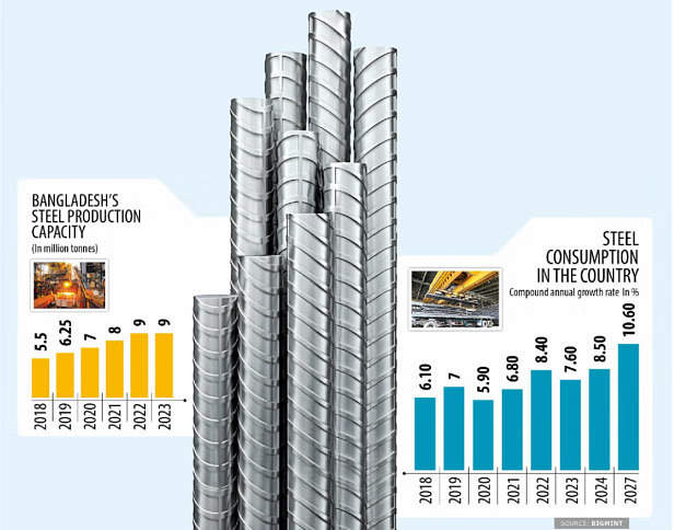 According to Bigmint's projection, Bangladesh's steel production capacity will increase to 1.30 crore tonnes by 2027.