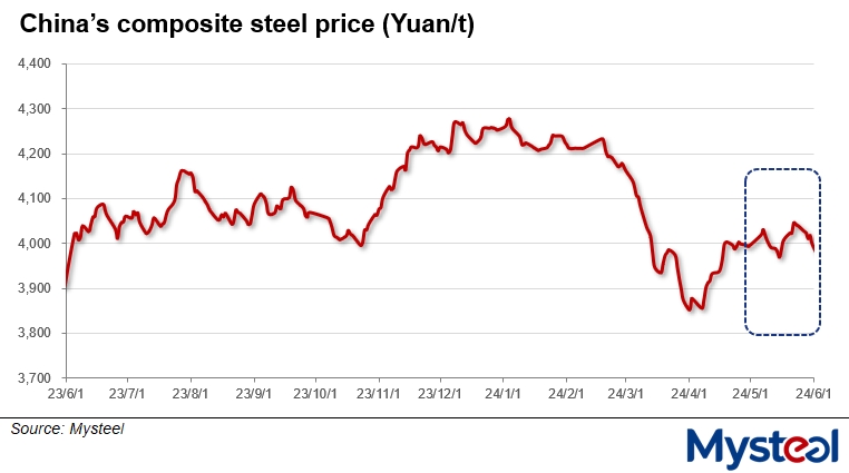 In fact, such opposite forces had already kept domestic steel prices in check in May, though the prices ended up slightly higher on month, Wang noted. By May 31, China's national composite steel price was assessed by Mysteel at Yuan 3,997.52/tonne ($562.8/t), up by Yuan 4.39/t on month.