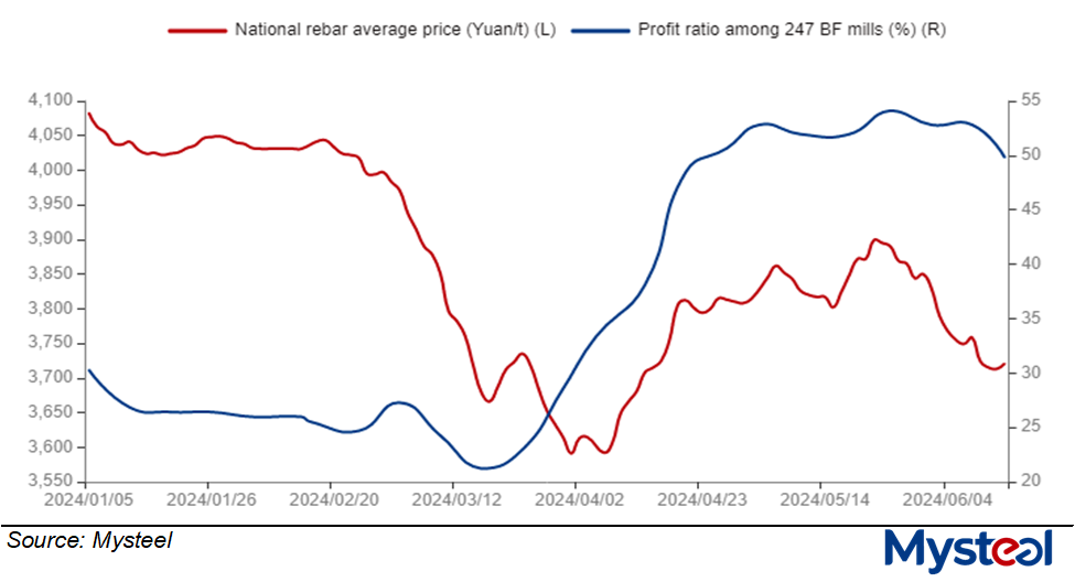 With the weakness in finished steel prices, the number of profitable steel mills in China has decreased. The results of the latest weekly survey show that as of June 13, the profit ratio among the 247 blast furnace mills nationwide under Mysteel's regular tracking averaged 49.78%, down by 3.03 percentage points from the prior week.