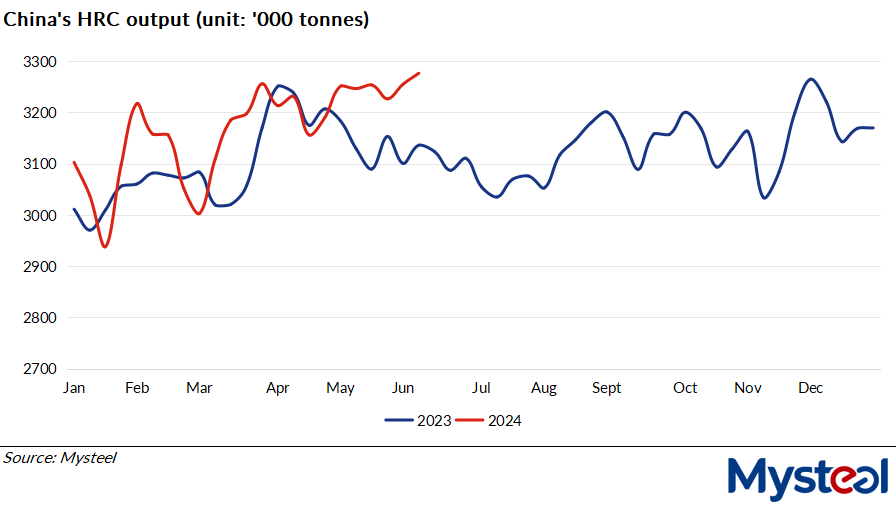 Production of hot-rolled coil (HRC) among the 37 Chinese flat steel producers Mysteel regularly monitors rose again by 21,300 tonnes or 0.65% on week to 3.28 million tonnes during June 10-14, the highest weekly total since mid-June 2022, the results of Mysteel's latest production survey show.
