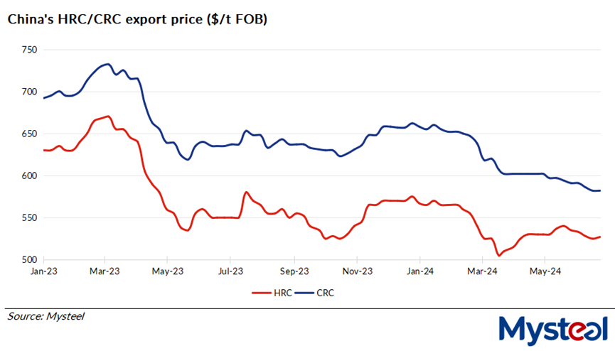 The on-week rises in their HRC export prices were mainly supported by the increases in China's domestic hot coil prices, Mysteel's roundup noted.