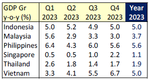 For the full year, while all ASEAN-6 countries registered positive growth in 2023, Indonesia, Singapore and Vietnam met their forecasts while Malaysia, Philippines and Thailand growths were below forecast.