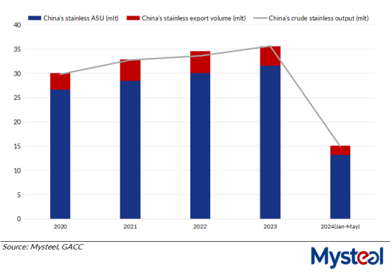 Simultaneously, from January to May, China's total stainless exports reached approximately 1.91 million tonnes, higher by a large 12.8% compared with the first five months of last year, according to data from the General Administration of Customs (GACC).