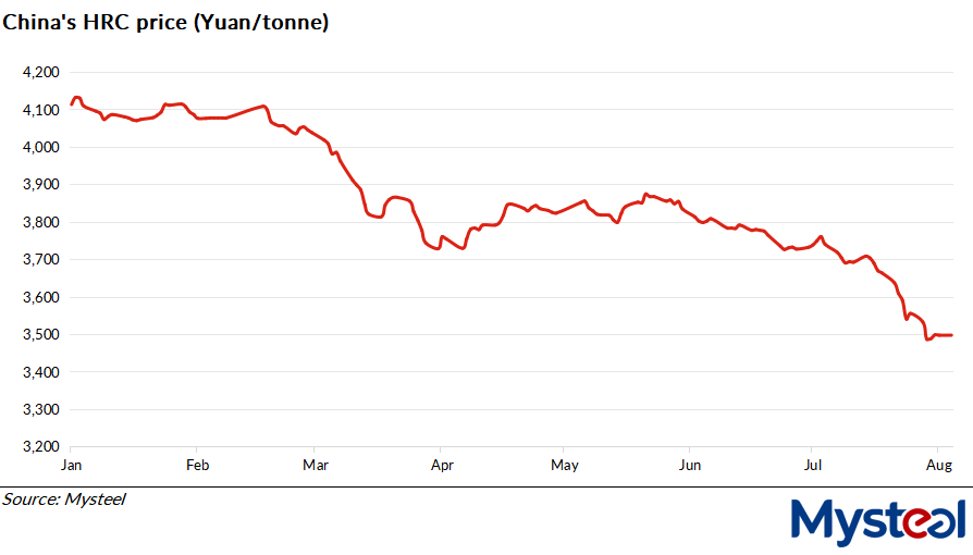 As of July 31, China's spot price of Q235 4.75mm HRC under Mysteel's assessment was at Yuan 3,488/t including the VAT, lower by Yuan 239/t or 6.4% on month.