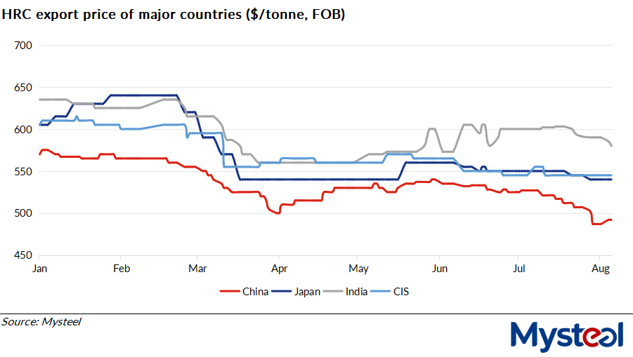 China's steel shipments abroad during July were mainly fulfilling orders booked about two months earlier in May, Mysteel Global noted.