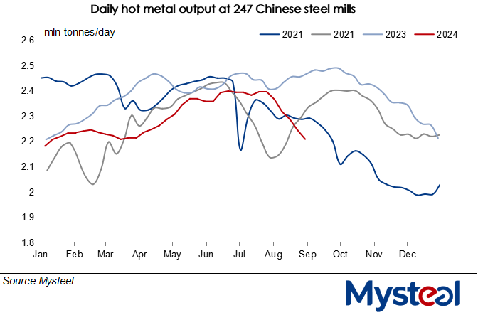 The coming September usually marks the beginning of China's autumn peak season for steel demand, which will likely spur most domestic mills into lifting their hot metal production significantly. However, Mysteel estimates that the daily hot metal output among the surveyed mills will stay largely flat at 2.26 million t/d, or up by a small 2,000 t/d on month.
