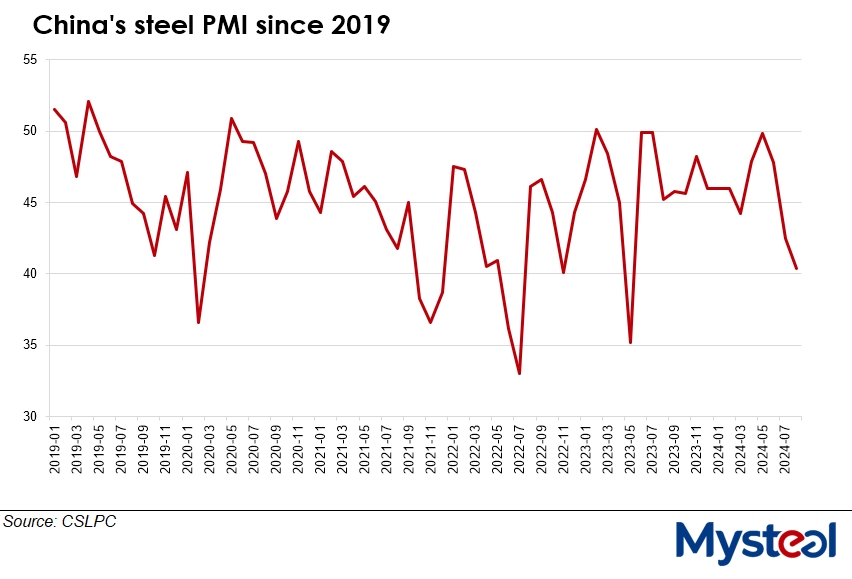The Purchasing Managers' Index (PMI) for China's steel industry was 40.4 in August, down from 42.5 for July and marking the third on-month decline, the official index compiler CFLP Steel Logistics Professional Committee (CSLPC) said in its August 31 release.