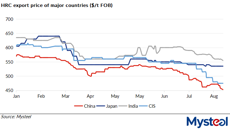 China's steel shipments abroad during August were mainly fulfilling orders signed about two months earlier in June, Mysteel Global noted.