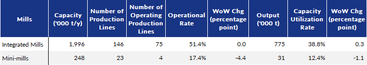 During the survey week, the rebar rolling capacity utilization rate among the surveyed producers moved up by 2.1 percentage points on week to 41.2%, and their operational rate edged up 0.6 percentage point on week to 36.7%, Mysteel's data showed.