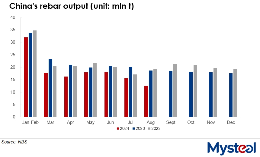 China's rebar production stood at 12.6 million tonnes in August, with the decline of 32.3% on year being faster than the 21.6% on-year drop for July, Mysteel Global noted from the latest data released by the country's National Bureau of Statistics (NBS) on Thursday. The August result was also 19.8% lower on month, the data showed.