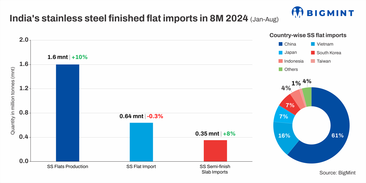 Meanwhile, India's overall imports of finished SS products remained stagnant at around 670,000 t during January-August 2024 from the previous year's 668,660 t. Longs comprise a miniscule 3% of the total with flats contributing the balance lion's share.