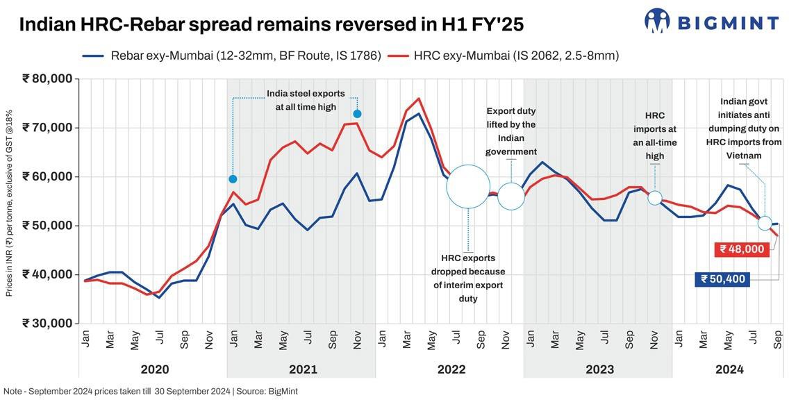 BigMint data reveals, imports in H1FY'25 were at a significant 5.1 million tonnes with September's volumes at an estimated 1.1 mnt. In comparison, H1FY'24's figure was at a far lower 3.3 mnt. The imports influx has been creating demand obstacles for domestic mills. That apart, India also experienced a production glut in HRCs with NMDC's Nagarnar Integrated Steel Plant having started commercial production last year and commissioning of JSPL's 5.5-mtpa HSM at Angul. This double whammy in the face of sluggish demand kept HRC prices suppressed through the first half. BigMint data shows India's production of HR coils/strips and equivalents rose to a provisional 26.10 mnt in H1FY'25 against 25.70 mnt in the same period last fiscal.