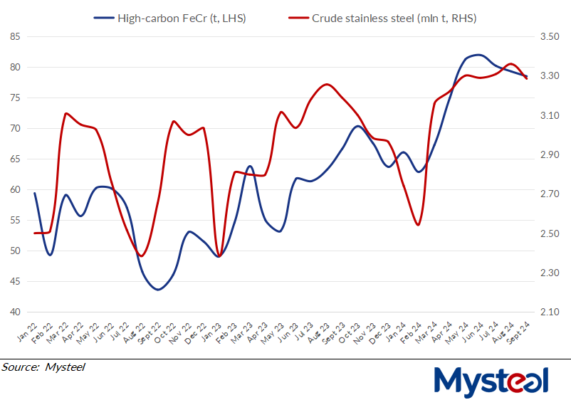 Mysteel's monthly survey, which covers 95% of domestic FeCr smelters, showed that output of high-carbon FeCr in September dipped slightly to 784,700 tonnes from 792,600 tonnes in August.