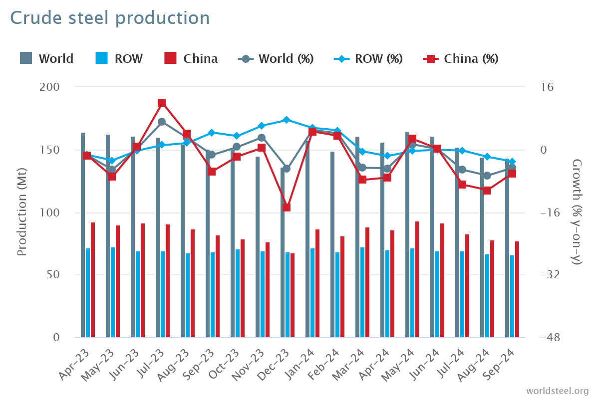 China produced 77.1 Mt in September 2024, down 6.1% on September 2023. India produced 11.7 Mt, down 0.2%. Japan produced 6.6 Mt, down 5.8%. The United States produced 6.7 Mt, up 1.2%. Russia is estimated to have produced 5.6 Mt, down 10.3%. South Korea produced 5.5 Mt, up 1.3%. Germany produced 3.0 Mt, up 4.3%. Türkiye produced 3.1 Mt, up 6.5%. Brazil produced 2.8 Mt, up 9.9%. Iran is estimated to have produced 1.5 Mt, down 41.2%.