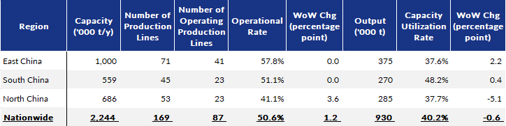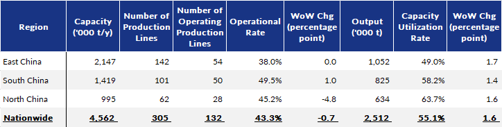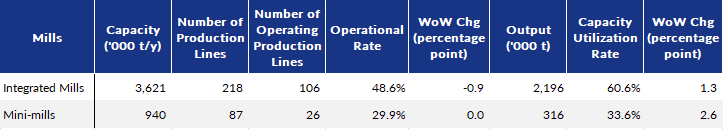 During the survey period, the rebar rolling capacity utilization rate among the surveyed producers rose 1.6 percentage points on week to 55.1%, but their operational rate slid 0.7 percentage point on week to 43.3%.