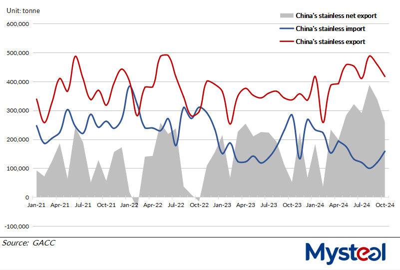 China exported approximately 417,400 tonnes of stainless steel in October, with the volume higher by 24.1% than the same month last year, yet the on-year growth narrowed from September's 34%, according to data released by the General Administration of Customs (GACC) on November 20.