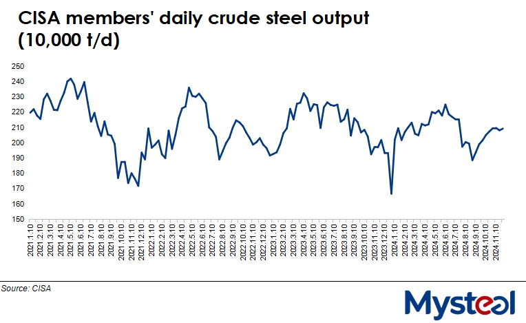 Based on the performance of its member mills, CISA also estimated the country's total daily crude steel output over November 21-30 at 2.65 million t/d, climbing by 0.5% from mid-November.