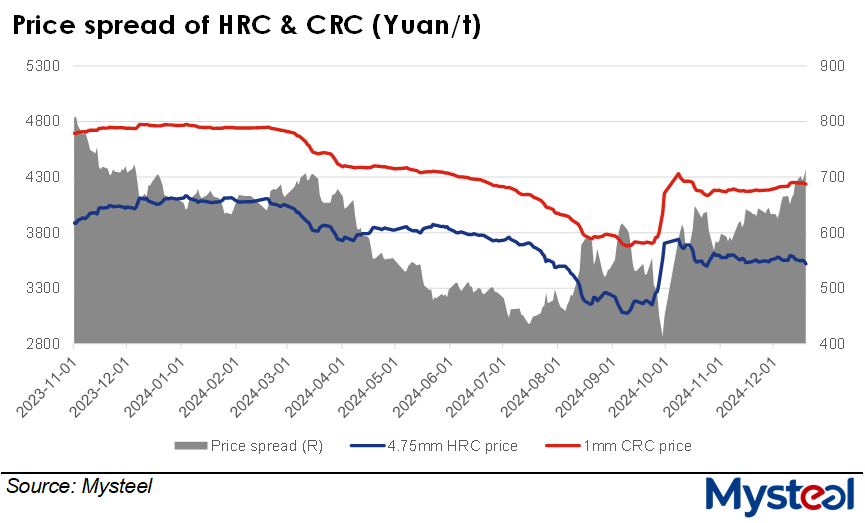 As of December 19, the spread between national average prices of 1mm CRC and Q235 4.75mm HRC under Mysteel's assessment came in at Yuan 716/tonne ($98/t), marking a significant rise compared with the gap of Yuan 633/t recorded one month earlier.