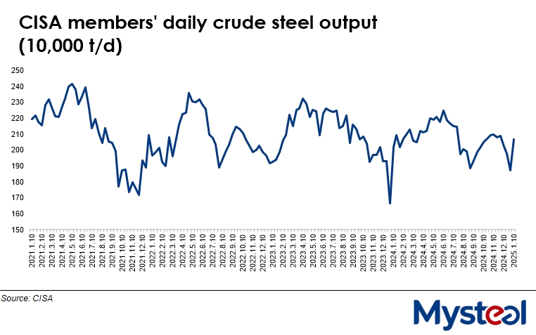 Daily crude steel output among the member mills of China Iron and Steel Association (CISA) recovered during the first ten days of January after declining for the previous three 10-day periods, according to the latest figures released on January 15 by the association.