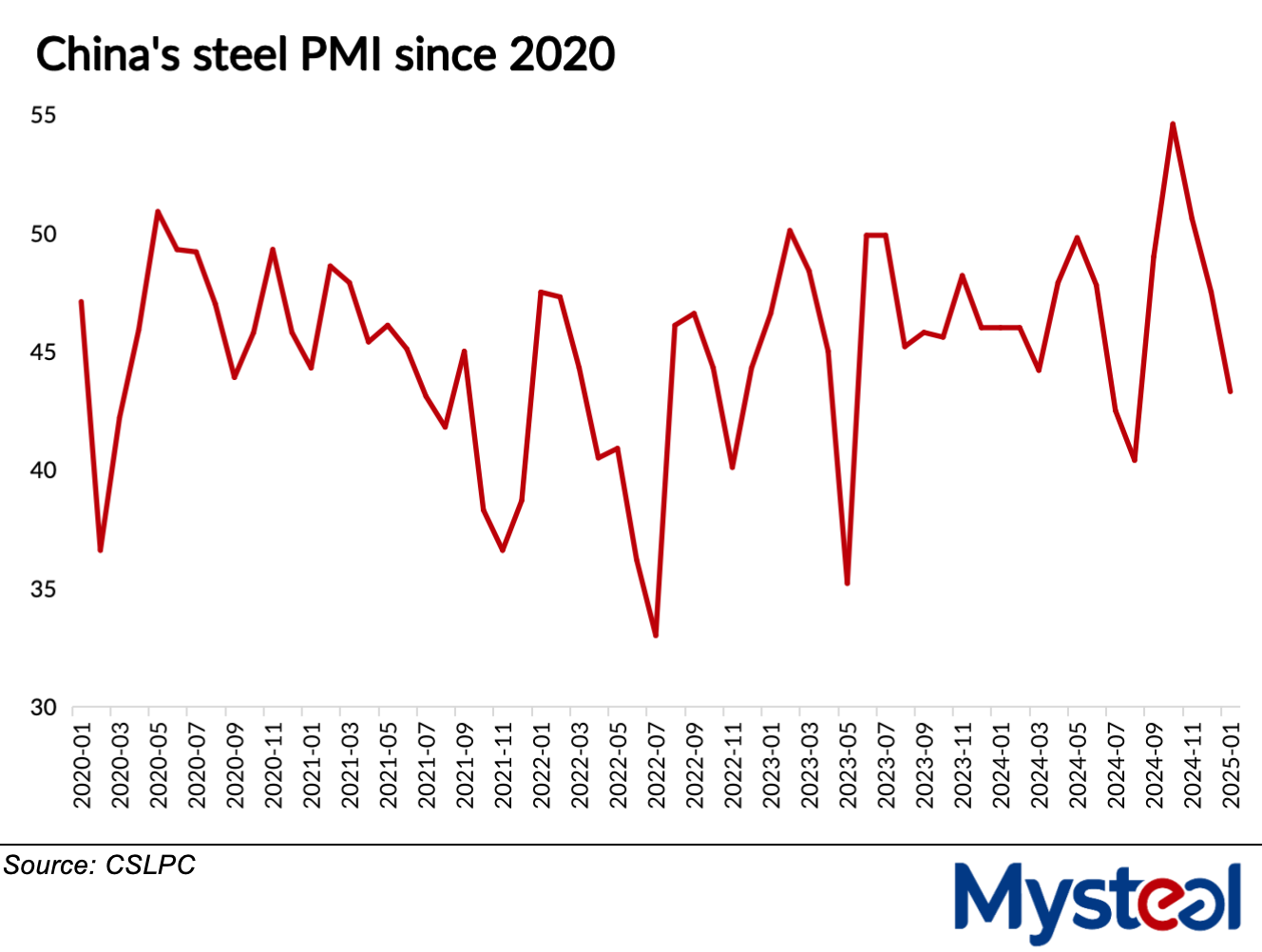 China's Purchasing Managers' Index (PMI) for the steel industry declined for the third consecutive month in January, settling at 43.3%, a 4.2 percentage point drop compared to December, according to the latest report from the CFLP Steel Logistics Professional Committee (CSLPC) released on January 27.