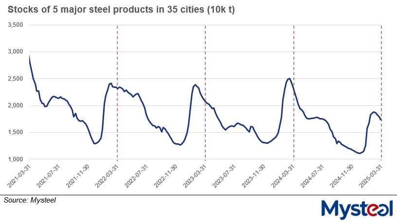 By the end of March, the total inventories of the five major carbon steel products held by steelmakers and trading houses across the 35 cities under Mysteel's monitoring had dropped by 7.5% on month to reach 17.4 million tonnes, which was also 22.4% lower from the same period last year.