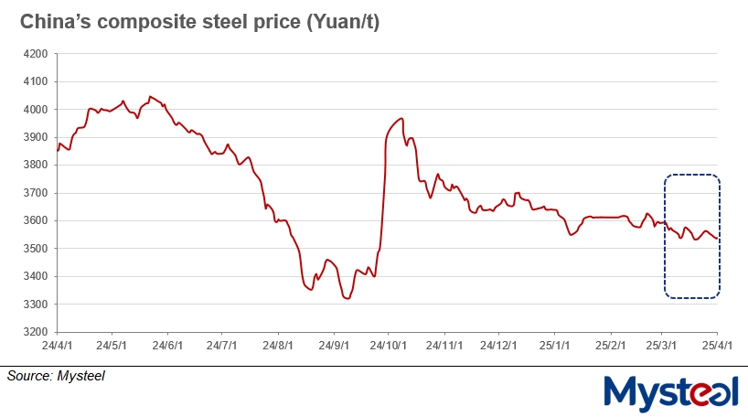 During March, China's average composite steel price was assessed by Mysteel at Yuan 3,556/tonne ($489.1/t) including the 13% VAT, lower by some Yuan 44/t from the average price in February.
