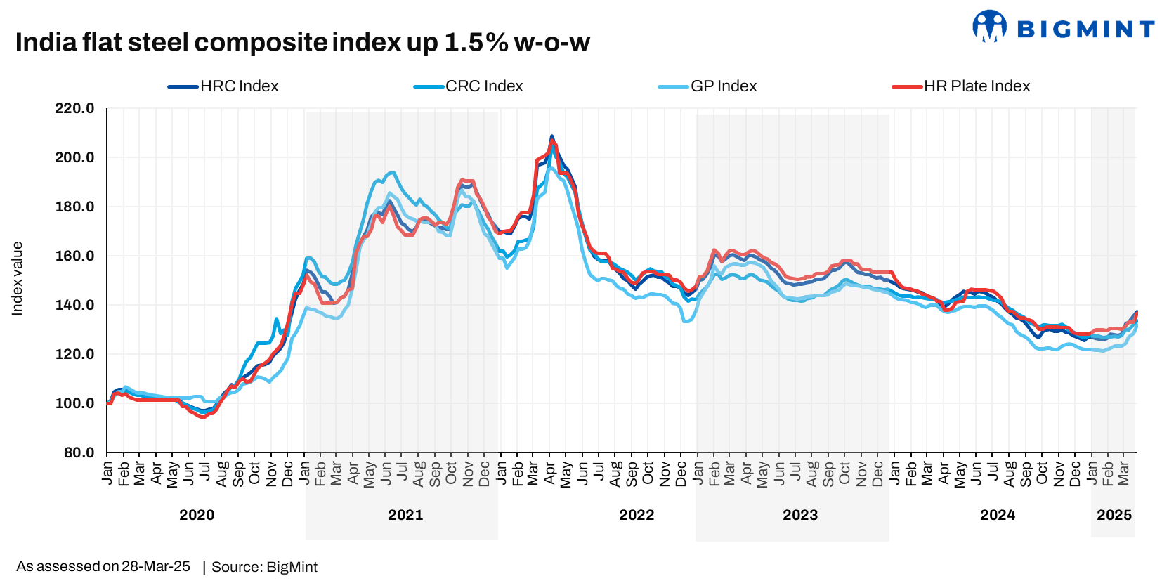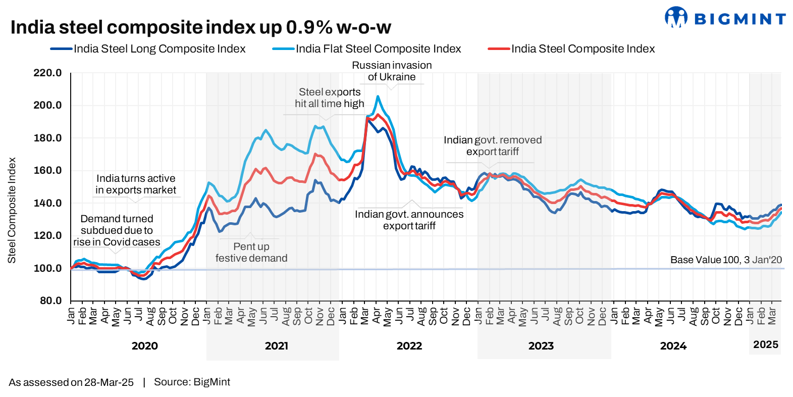 Morning Brief: BigMint's India Steel Composite Index climbed up by 0.9% w-o-w to a nine-month high of 136.9 points on 28 March 2025, as prices continued to rally following the safeguard duty recommendation. Supply shortages also pushed up prices in certain segments.