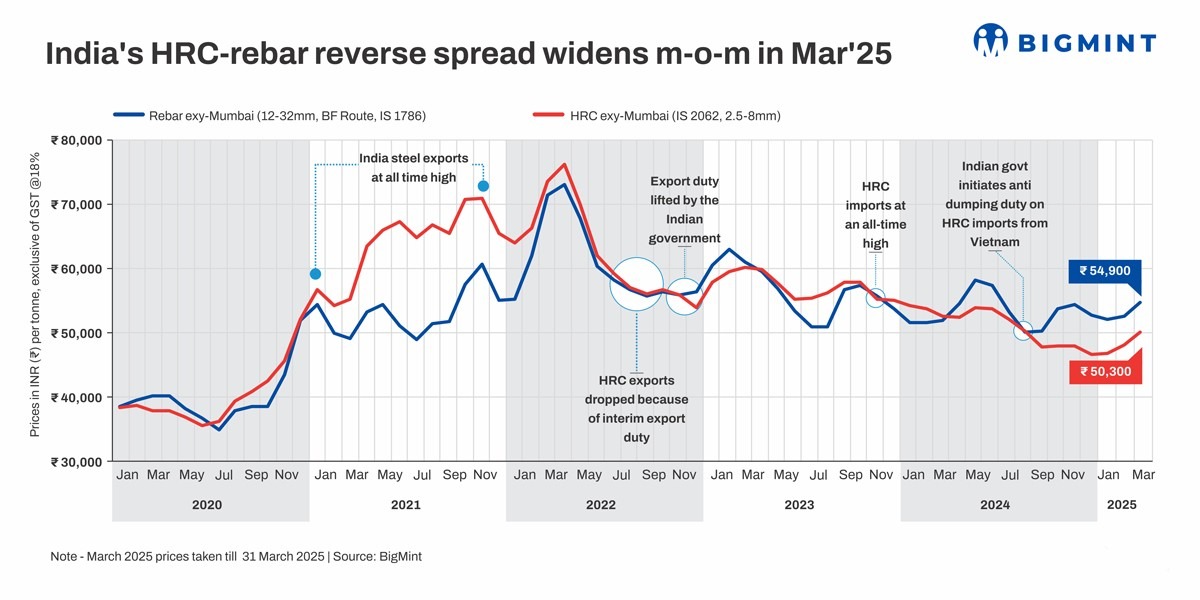 Morning Brief: India's HRC-rebar reverse spread widened again in March 2025, after three months of contraction. The price gap between hot-rolled coils (HRCs) and blast furnace (BF) rebars stood at INR - 4,600/tonne (t) ($54/t) last month compared to INR - 4,400/t ($51/t) in February, a difference of INR - 200/t ($2/t).