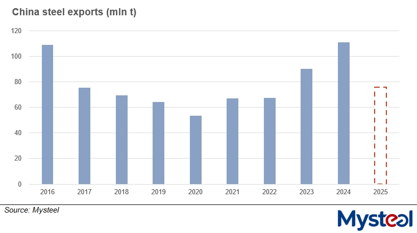 "China's direct and indirect steel exports are expected to decrease by 30-40 million tonnes overall this year, while domestic steel demand is projected to fall by around 5-10 million tonnes," Wang estimates.