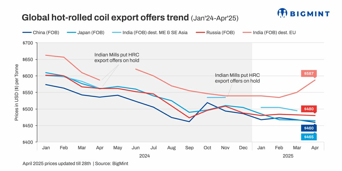 Chinese HRC offers at record lows: Chinese hot rolled coil (HRC) offers fell 2% to $460/tonne (t) FOB as the country struggled with increased steel production, and sustained lack of demand from a declining property construction sector. Manufacturing and infrastructure, the two other steel consuming pivots, showed negligible m-o-m uptick. Mills continued to depend on exports to keep the cash registers jangling. Thus, the predatory pricing trend sustained while steel demand globally continued to head north, rising over 6% to around 27 mnt y-o-y in the first three months of 2025, supporting the aggressive pricing strategy. The $460/t CFR is the lowest since 2021, the year from which BigMint has been recording this data.
