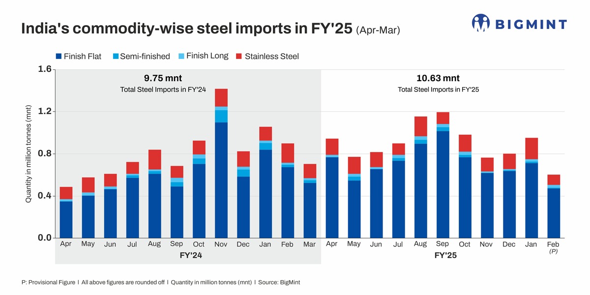India's steel imports (including stainless steel) totalled 10.63 million tonnes (mnt) in FY'25, up 9% from 9.75 mnt in FY'24, according to provisional data with BigMint. This is the highest volume recorded in nine years.