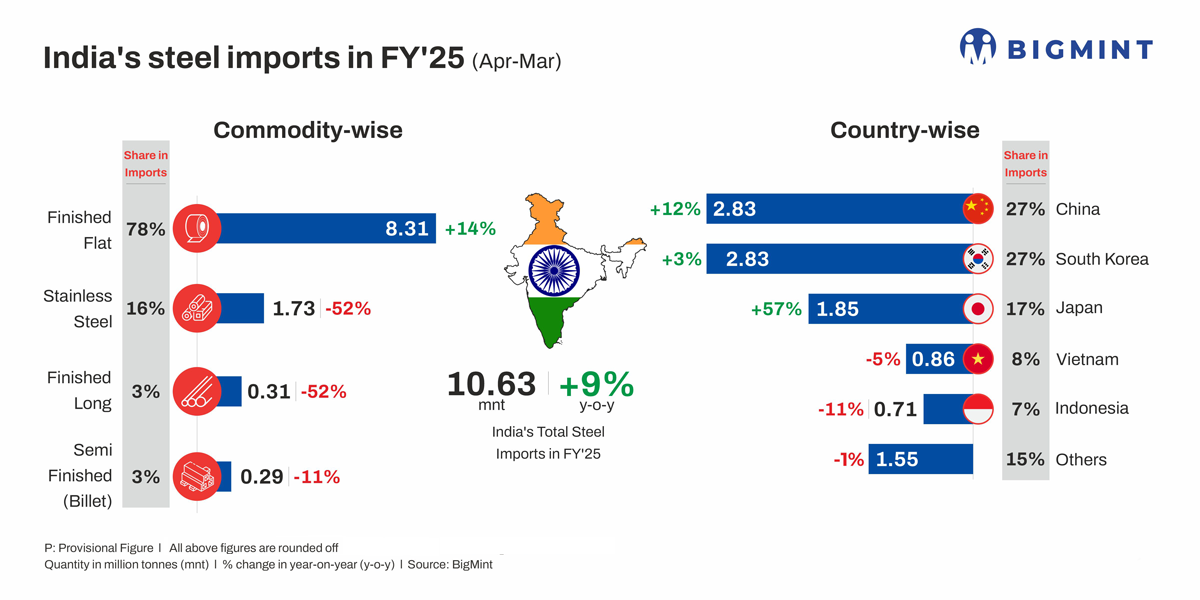 Finished flats, which comprised 89% of India's total import volumes, stood at 9.47 mnt in FY'25, up 14% from 8.31 mnt in FY'24.