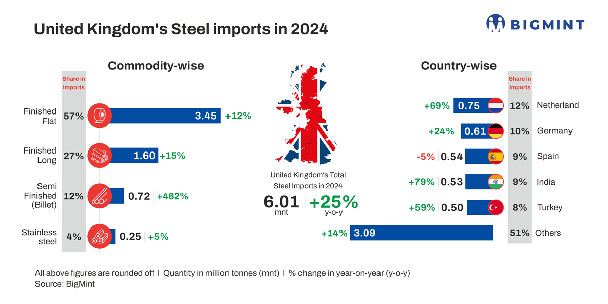 BigMint data show that steel imports into the UK increased by 25% y-o-y to over 6 mnt in CY'24. Imports of finished flats soared by 12% y-o-y to 3.45 mnt.
