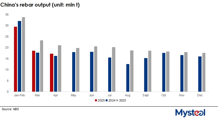 China's rebar production declined by 0.9% on year during this year's first four months to reach 65.4 million tonnes, according to the latest data released by the country's National Bureau of Statistics (NBS) on May 20. Within the total volume, 17.3 million tonnes were produced during April alone, rising by 5.9% on year.