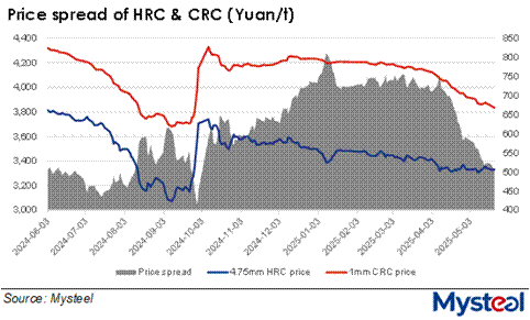 The price spread between cold-rolled coil (CRC) and hot-rolled coil (HRC) in China has narrowed steadily since mid-April, as CRC prices have declined more rapidly amid negative market sentiment and persistent supply-demand imbalance, Mysteel Global learned.