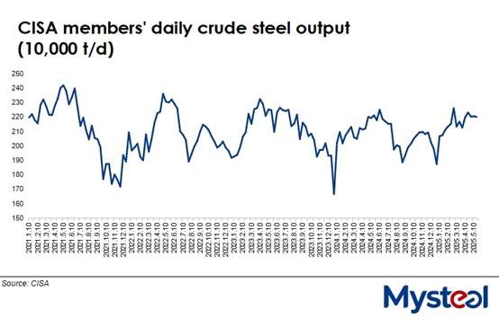 The CISA showed that during mid-May, these member mills' crude steel production nudged down by 6,000 tonnes/day from May 1-10 to 2.2 million t/d on average, which was also 0.5% lower on year.
