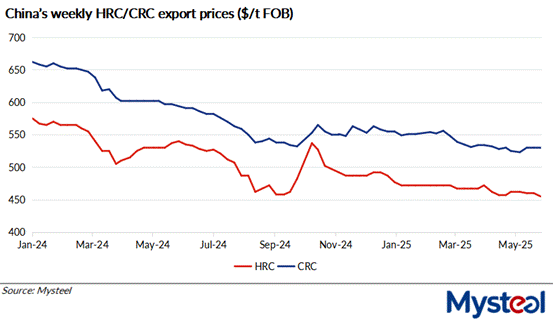 China's export price for SS400 3mm hot-rolled coil (HRC) from North China's Tianjin port had declined by $7/tonne on week as of May 30 to sit at $455/tonne FOB, according to Mysteel's assessment.