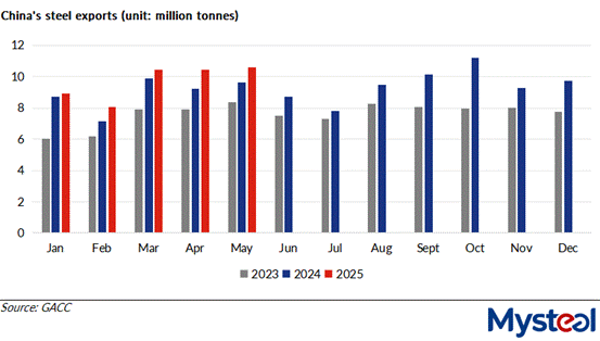 For May alone, the country's steel exports increased by 9.8% on year to 10.58 million tonnes, the highest for any month since October 2024, Mysteel Global observed.