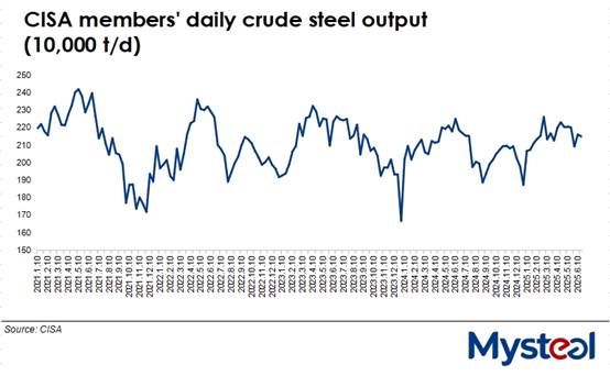 Daily crude steel output among the member mills of the China Iron and Steel Association (CISA) retreated over June 11-20 from the first ten days of this month, declining by 0.5% or by 11,000 tonnes/day to 2.15 million t/d on average, according to the association's latest release on June 26. Average daily output during mid-June was also 1.7% lower than during the same period last year, it notes.