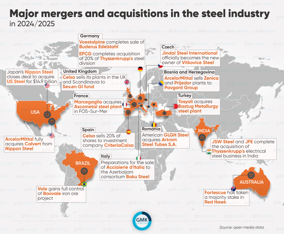 Thus, over the past two years, there has been a major reconfiguration of the steel market: Japan has strengthened its presence in the US, ArcelorMittal in North and South America, and in Europe, the redistribution of assets between private and industrial players continues.