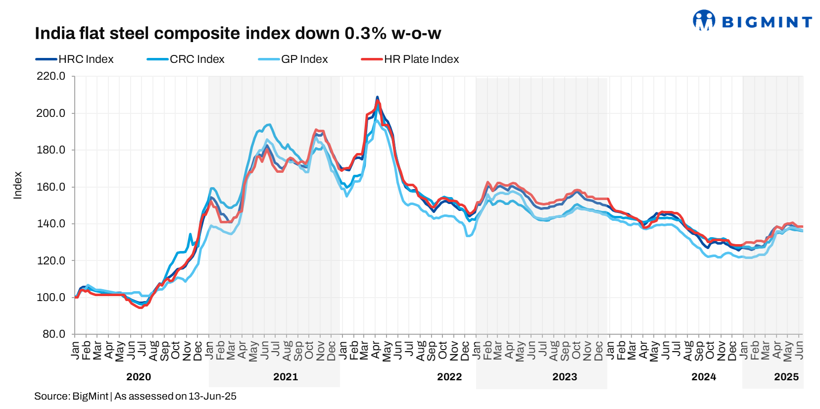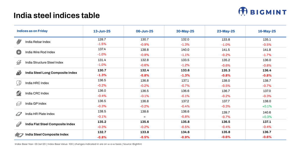 Morning Brief:The depression in the domestic steel market deepened towards mid-June 2025, with steel prices continuing their steady downward spiral. BigMints India steel composite index, a fixed reference point for the domestic steel market, dropped 0.8% w-o-w on 13 June, with long steel prices correcting more sharply than flats.