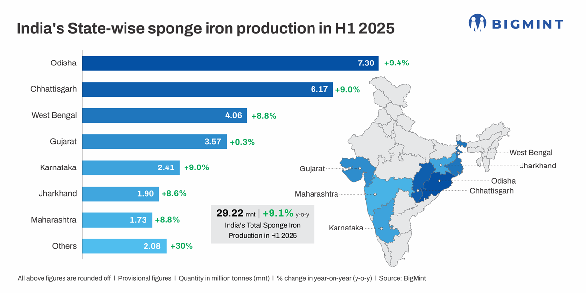 Odisha (+9.4% y-o-y), Chhattisgarh (+9% y-o-y), and West Bengal (+8.8% y-o-y) were the leading producers in the first half of this year. Conversely, billet output is expected to have witnessed 5-7% growth in H1CY25, though final figures are not available. This is attributed to improving finished steel demand and a strengthening in domestic pricing during Q1CY25. Rapid growth in production capacities may have contributed to the oversupply in the market and the consequent price correction, especially for sponge iron.